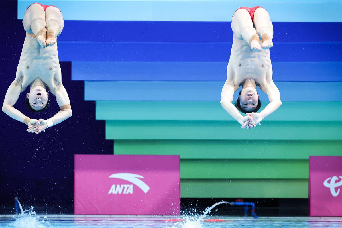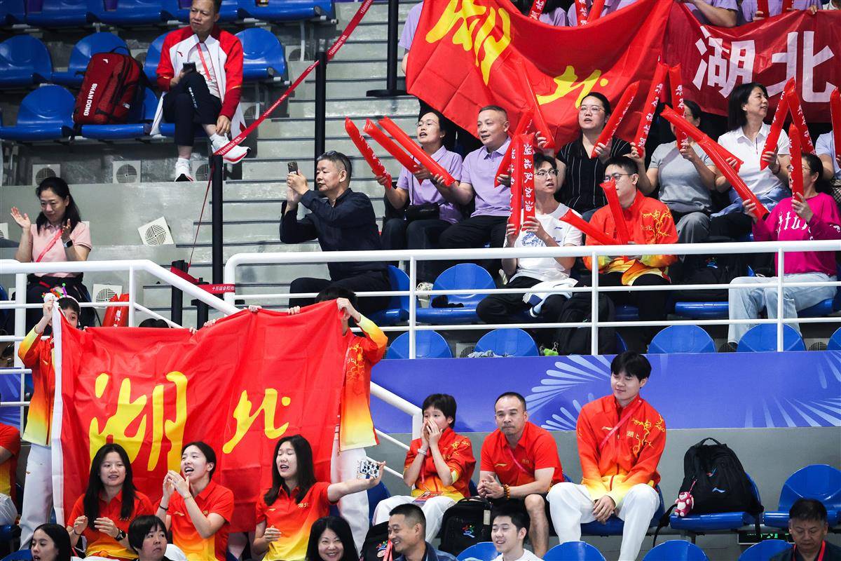 11月3日,广东奥体中心游泳馆,第十五届全运会跳水项目展开男子团体决赛的争夺。在双人3米板比赛中,湖北组合王宗源/郑九源以266.88分力压广东组合谢思埸/黄博文位列第一。看台上,王宗源父母与湖北助威团一起为湖北健儿加油。