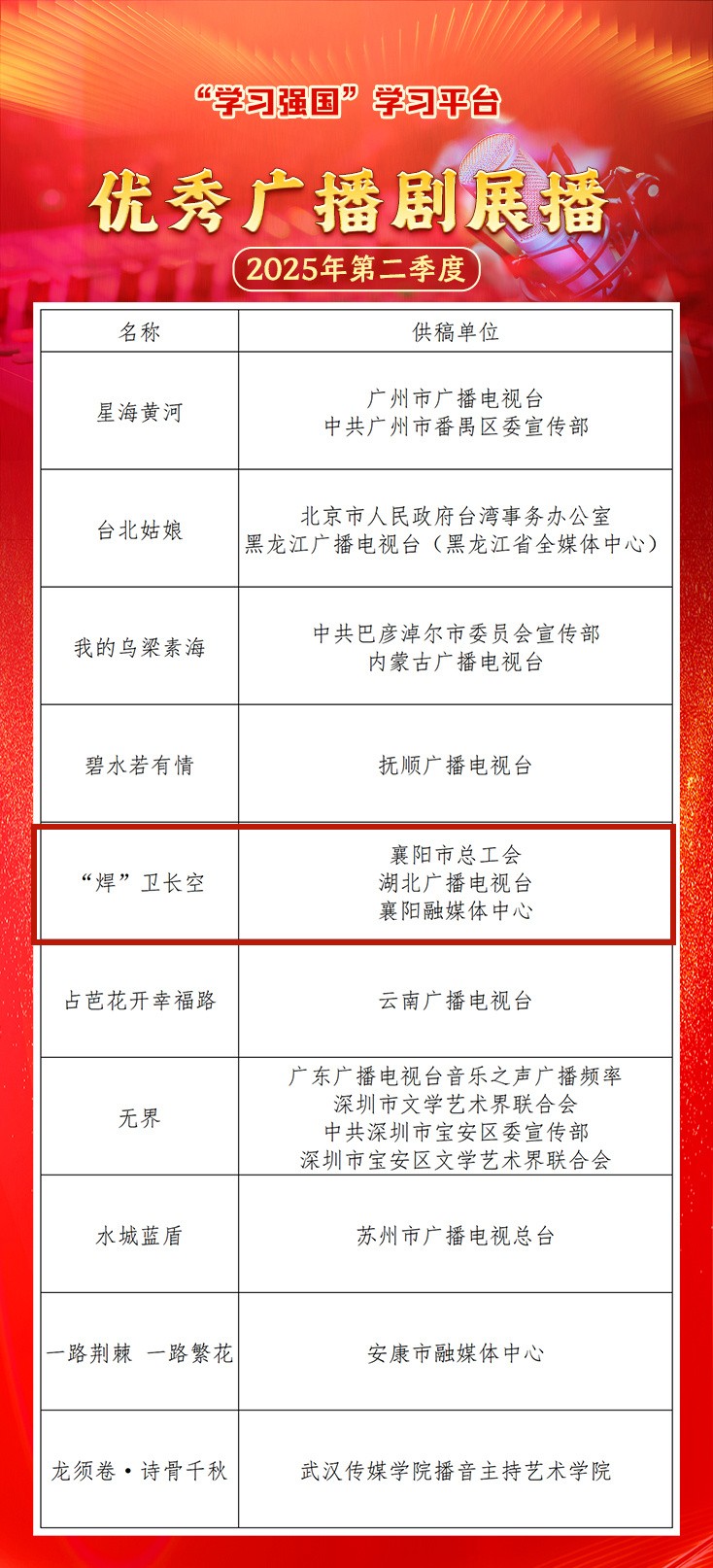 近日,“学习强国”学习电台2025年第二季度优秀广播剧展播活动举行。由襄阳市委宣传部指导,襄阳市总工会、湖北广播电视台、襄阳融媒体中心联合出品的广播剧《“焊”卫长空》入选优秀广播剧展播。