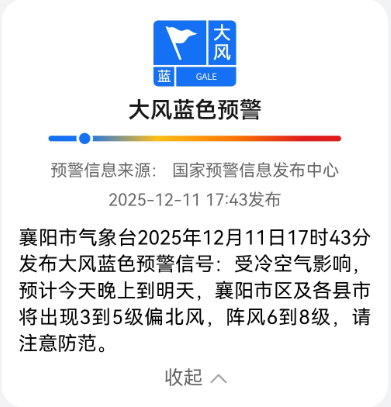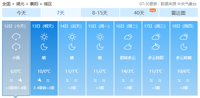 襄阳方面:预计今天襄阳小雨转雨夹雪,西部高山区小到中雪,局地伴有冻雨,气温显著下降;明后天转晴,日最高气温有所回升。14日早晨最低气温将降至0度以下,山区降至-4度左右。此外,受冷空气影响,12日至13日白天北风风力加大,阵风6到8级。
