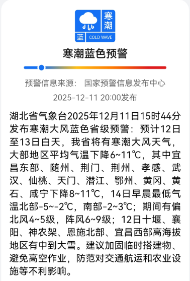 根据气象预报,预计12月12日至12月13日有寒潮大风雨雪天气,平均气温下降7℃~11℃,最低气温北部降至-5℃~-2℃、南部降至-2℃~1℃,偏北阵风7~10级,其中12月12日十堰、襄阳、神农架、恩施北部、宜昌西部等地山区有中到大雪,积雪深度4~8厘米。