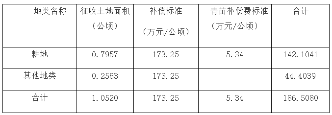 (一)征收土地补偿费和安置补助费。根据《省人民政府关于重新公布全省征地区片综合地价标准的通知》(鄂政发〔2023〕16号)规定执行,庞公街道庞公祠社区位于我市征地区片综合地价II级区域,执行标准为173.25万元/公顷,补偿费总额182.2590万元(含土地补偿费72.9036万元、安置补助费109.3554万元)。
