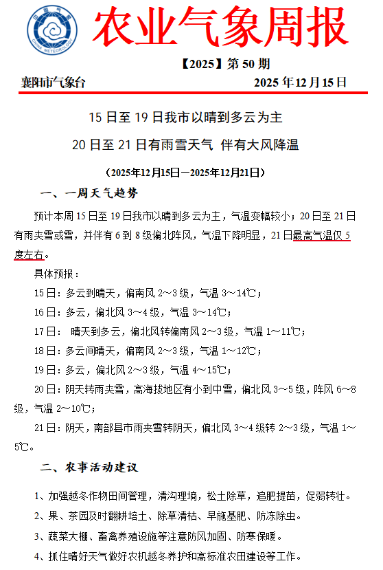 12月15日,襄阳市气象台发布农业气象周报,周末两天(12月20日至21日),襄阳有雨雪天气,伴有大风降温。