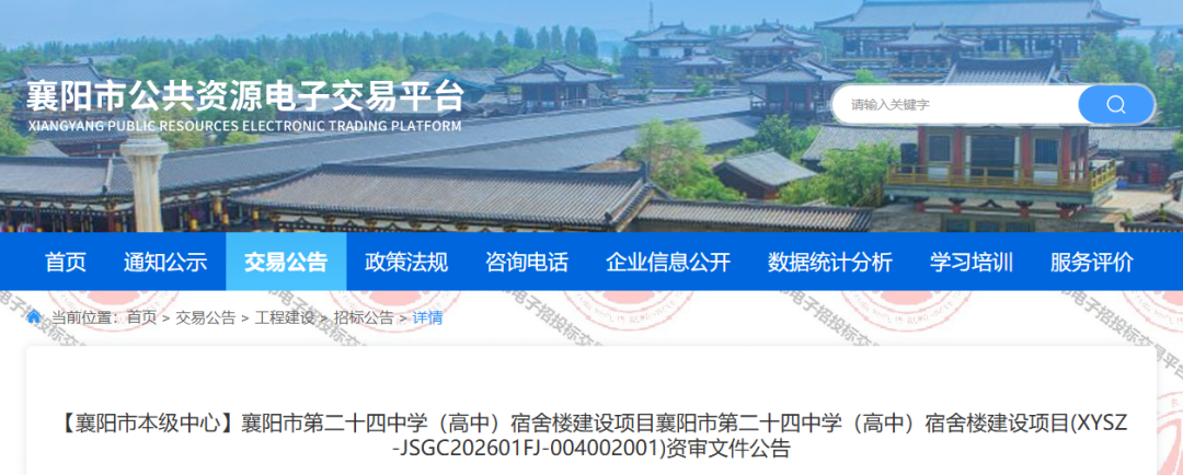 近日,襄阳市公共资源电子交易平台发布最新公告,事关襄阳第二十四中学(高中)宿舍楼建设项目。
