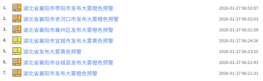 01月27日06时21分,襄阳市气象台发布大雾橙色预警信号。