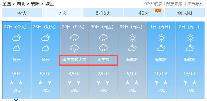 29日至30日,襄阳有一次雨雪过程,29日夜间逐渐转雪,西部地区中到大雪,高海拔山区局部暴雪,东部地区小到中雪,平均气温下降3~6°C,偏北阵风5~7级。