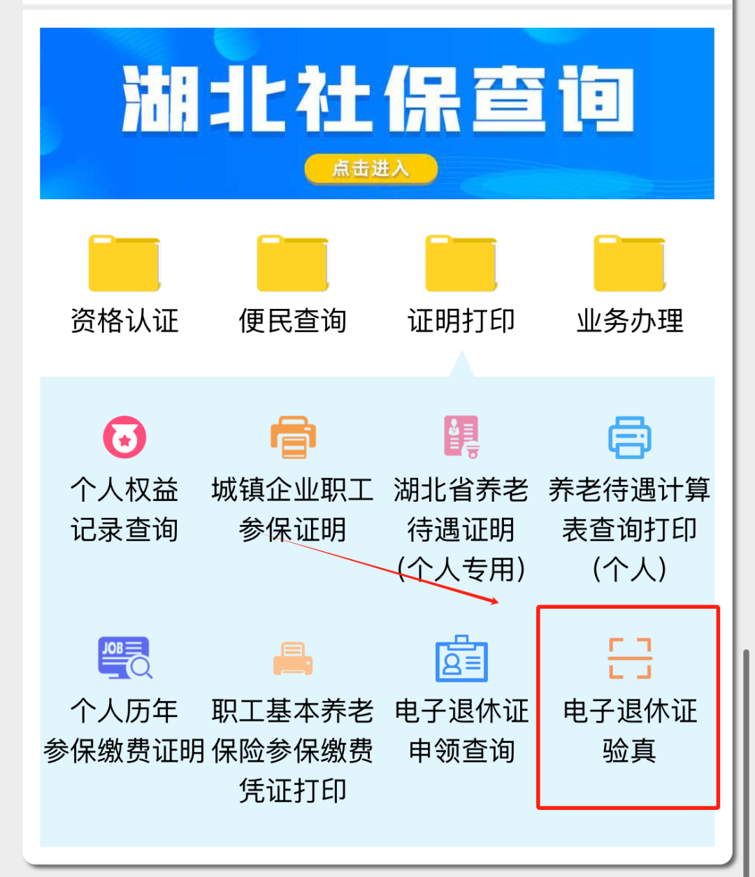 通过“电子社保卡”微信或支付宝小程序、“湖北12333”微信公众号、“湖北智慧人社”支付宝小程序申领的电子退休证,在任意渠道展示时,将同步显示“验真二维码”。